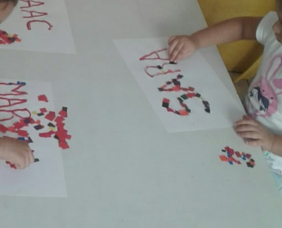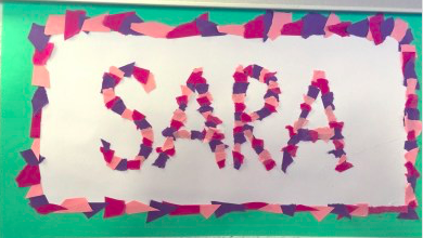 Y por último escribiremos nuestro nombre en grande, (si no podemos nosotros solos nos ayudarán) e iremos pegando los rectángulos en las letras variando los colores según nos vaya apeteciendo.