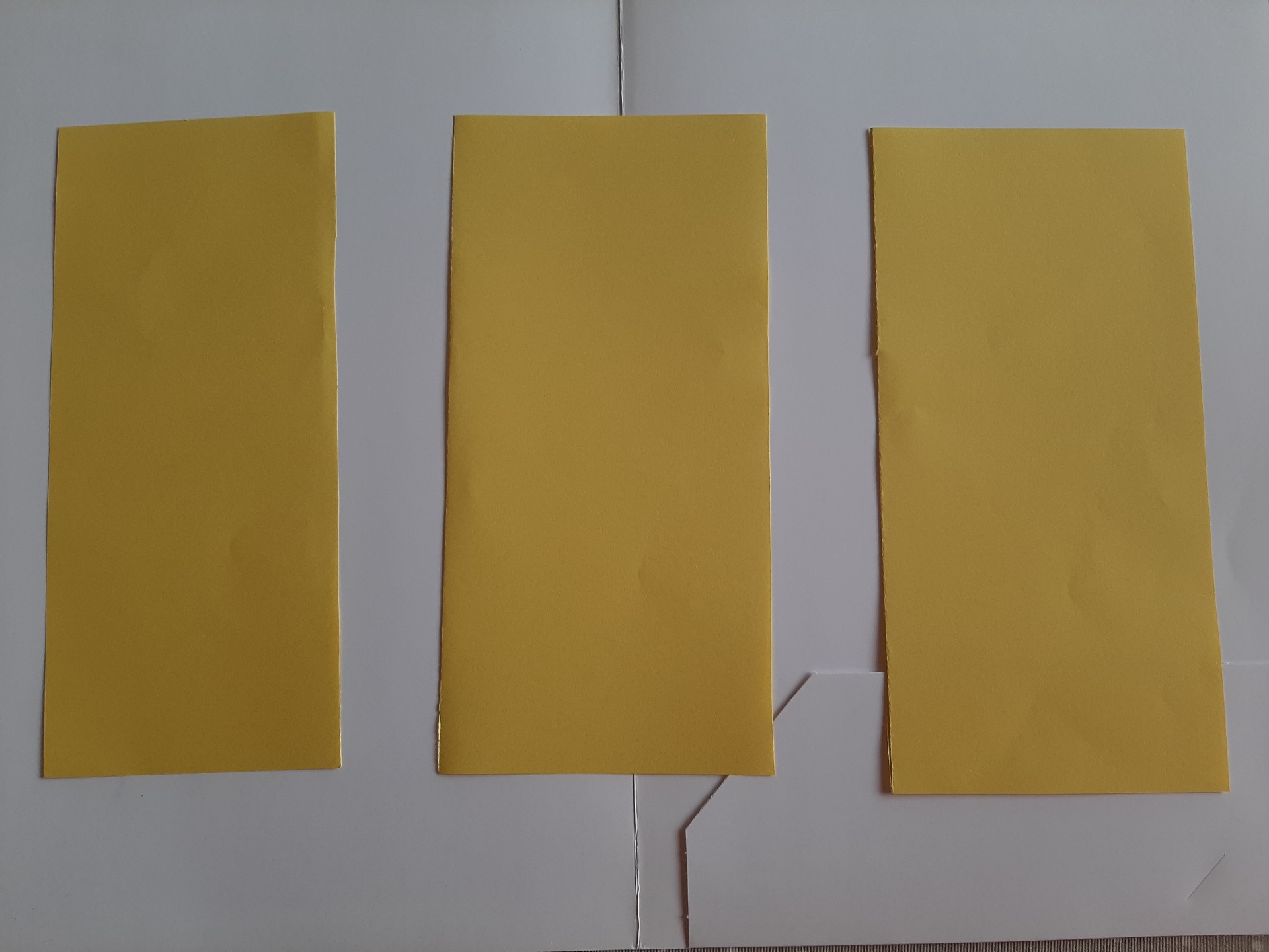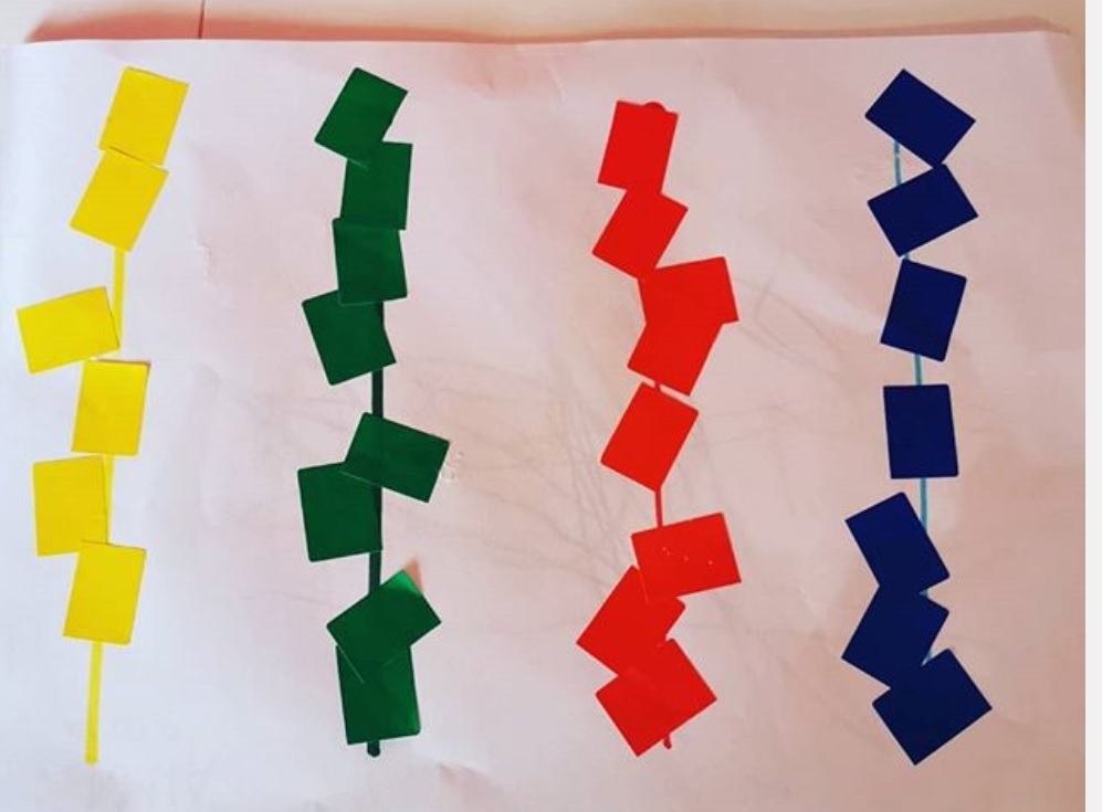 Una vez hemos terminado de recortar, mamá o papá nos dibujarán unas líneas verticales en un folio y nosotros iremos pegando en cada línea los rectángulos de un color, de la siguiente manera: