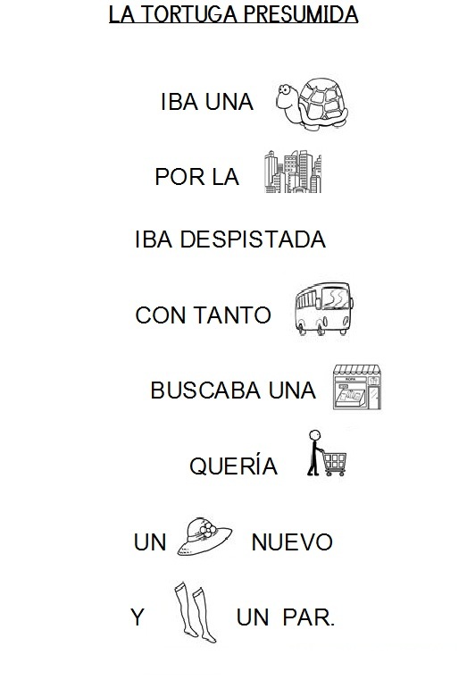 Hoy os presento una poesía, "La tortuga presumida", es una poesía de Gloria Fuertes, muy divertida en la que una tortuga va a la ciudad para comprar. Os envío el texto entero para que os la vayáis aprendiendo poco a poco. Mamá, papá o los hermanos nos irán diciendo un verso y nosotros lo iremos repitiendo, así nos la iremos aprendiendo. También os la mando con pictogramas, para que nos la vayan leyendo y nosotros completemos con el dibujo.