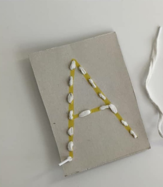 Una vez repasada la A, en un cartón mamá o papá nos la escribirán de nuevo y nosotros con un punzón haremos agujeritos separados unos de otros siguiendo el camino de su grafía (podemos pedir ayuda a nuestra familia) y seguidamente con un cordón de un zapato, con una cuerda o un trozo de lana, vamos a coser la letra A de la siguiente manera: