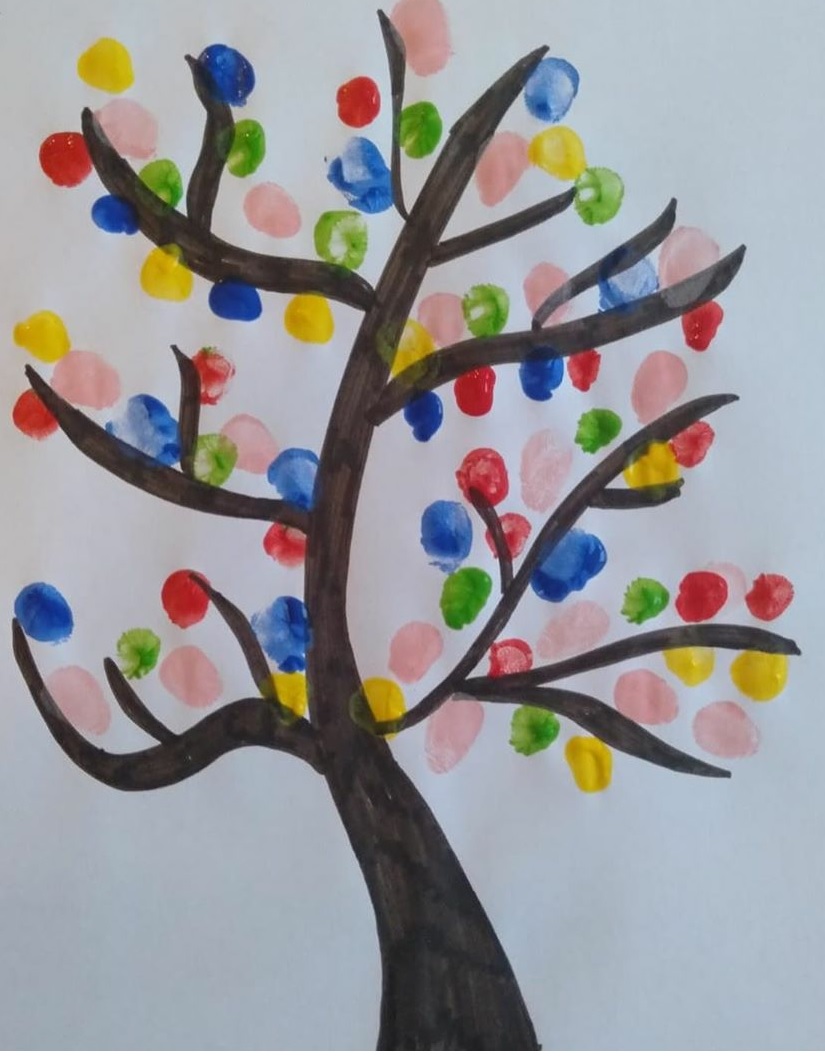 Ahora con témperas o pinturas de dedos iremos mojando nuestro dedo índice e iremos estampándolo en las ramas de árbol a modo de flores utilizando todos los colores.